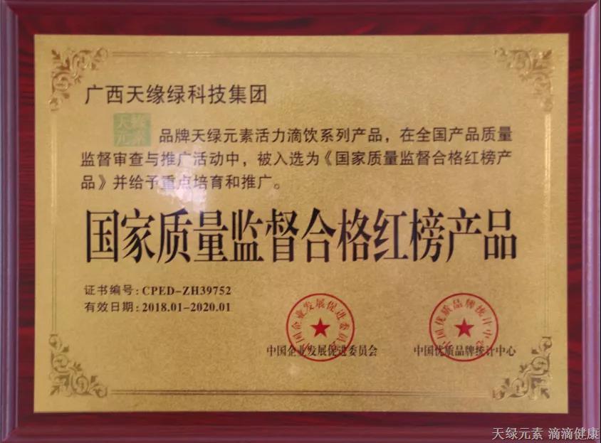 2018年1月15日天綠元素榮獲國家質(zhì)量監(jiān)督合格紅榜產(chǎn)品