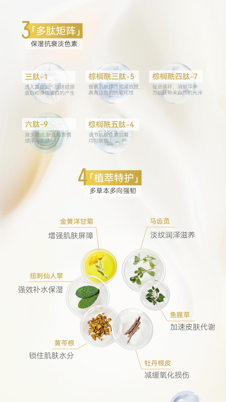 天姿蕉顏煥顏精華液,蘊(yùn)含三肽-1、六肽-9、棕櫚酰三肽-5、棕櫚酰五肽-4、棕櫚酰四肽-7等多種肽類,甄選天然植物大蕉果、金黃洋甘菊、牡丹根皮、扭刺仙人掌莖、馬齒莧等多種植萃精華。